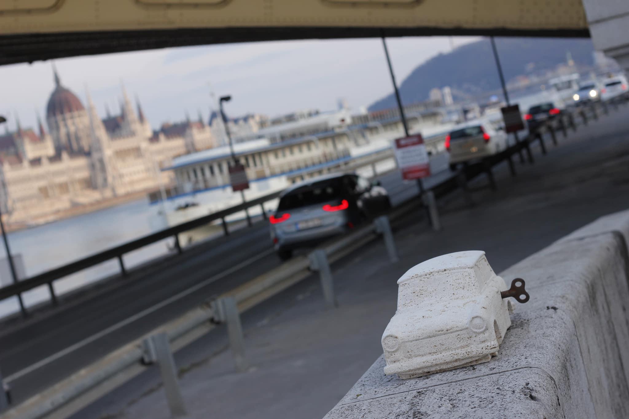 A Margit híd budai hídfője alatt kezdjük a sétát, ahol egy mészkő Trabant szobrot láthatunk. A Kolodko-szobrok általában fémből vannak, ennek a mészkőszobornak azonban a felhúzó kulcsa van csak fémből. Az autó a Kisvakondból ismert felhúzós játékautóra emlékeztet. Ha megnéztük a Trabantot, menjünk fel a hídra és sétáljunk el a Nyugati térre, hiszen ott vár a következő alkotás.