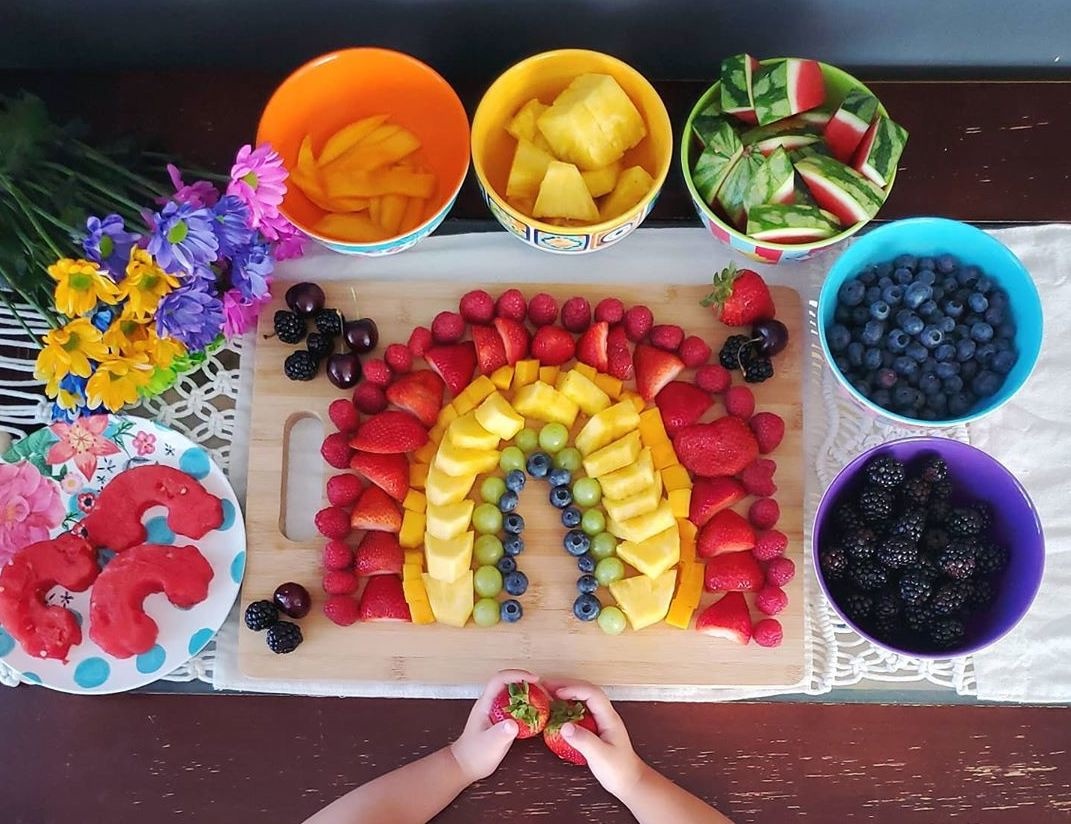 Kicsi gyümölcsöket és zöldségeket válogassunk a szivárvány színeiben: pl. áfonya, málna, paradicsom. Ha nehe- zen fogynak a zöldségek, kiszaggathatjuk különböző tésztaformákkal, így az unalmas uborkából izgalmas állatokat varázsolhatunk.