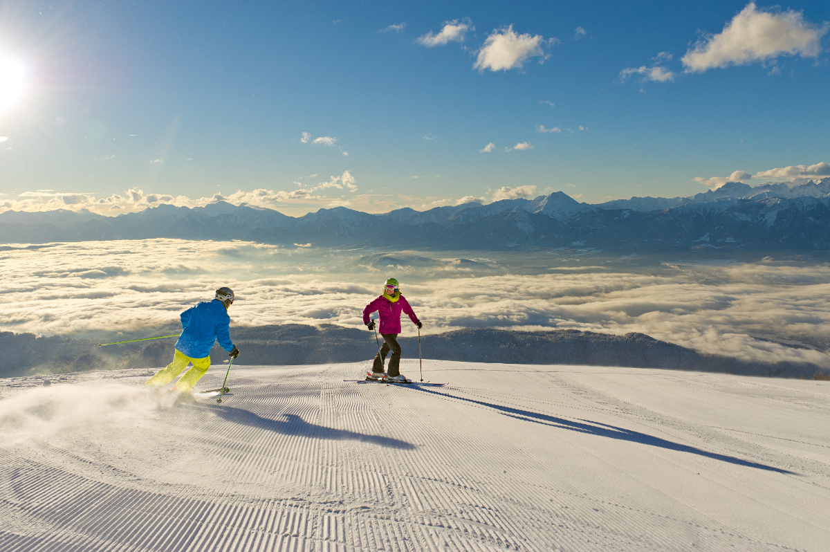 A síelés napját őszintén szólva némi szorongással vártuk. Teljesen kezdőként, korábbi tapasztalat nélkül nehéz elképzelni, milyen lesz először lécre állni. Utólag viszont kiderült, hogy teljesen felesleges volt az aggodalom. A Gerlitzen már önmagában is lenyűgöző hely – akkor is megéri felmenni a hegyre, ha valaki egyetlen kanyart sem tervez a pályákon. A csúcs közelében található hüttékből olyan panoráma nyílik a karintiai tavakra és hegyvonulatokra, amely hosszú percekre ott tartja az embert egy gőzölgő tea vagy egy forralt bor mellett.