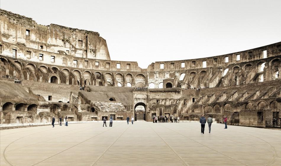 Az arénát Vespasianus császár építtette az 1. században, a munkálatok i.sz. 72-ben kezdődtek és i.sz. 80-ban készült el a monumentális épület a Forum Romanum délkeleti végén. Az ókori aréna földszintje a 19. század óta szinte teljesen hiányzik, hiszen akkor az olasz régészek úgy döntöttek, hogy így mutatják meg Colosseum föld alatti alagutait és folyosóit. 2010 óta a föld alatti részt is megnyitották a látogatók előtt, ám az épület állagromlása egyre jobban felgyorsult. Olyan megoldást kellett találni a felújítás közben, hogy a látogatói élmény ne csorbuljon, de az épület se rongálódjon feleslegesen. 2014 óta az Olasz Kulturális Minisztérium azzal a gondolattal játszott, hogy újból padlót helyez el a Colosseum földszintjén, ami egyébként az ókorban a küzdőtér volt.