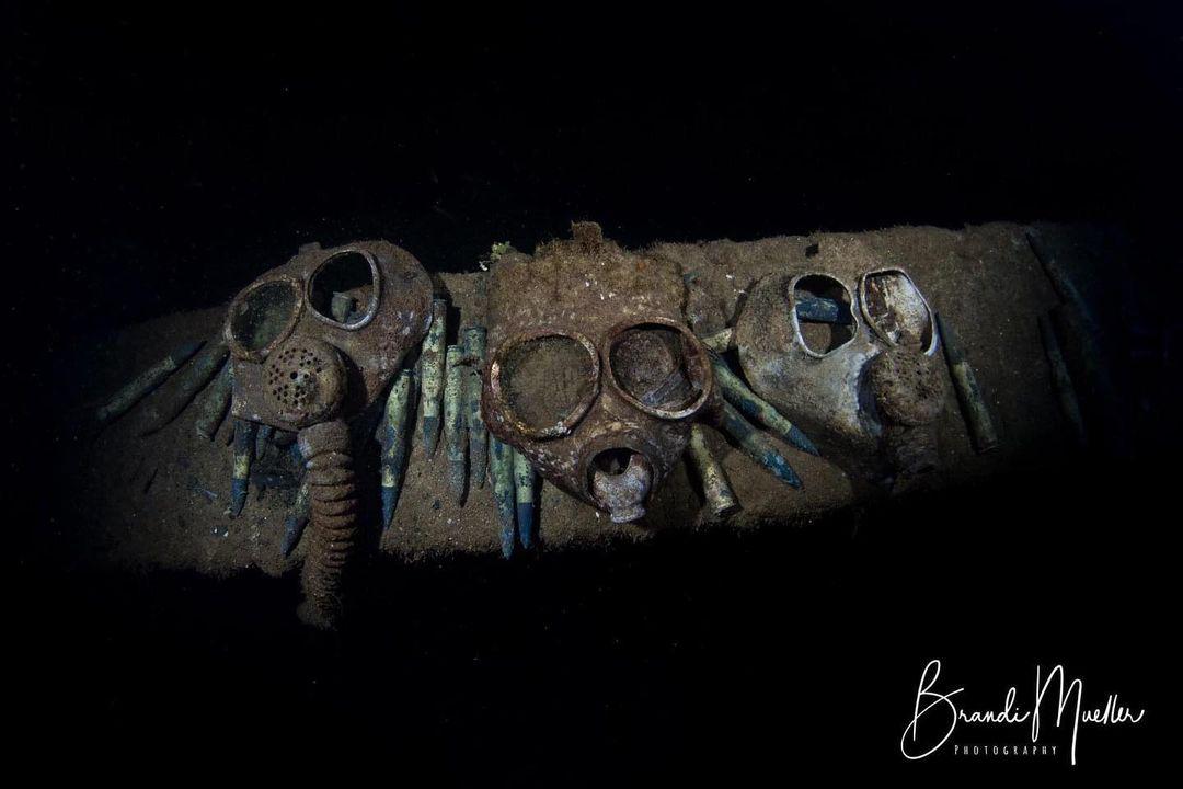 A képen látható gázmaszkokat a második világháborúban a japánok használták, és a mikronéziai Chuuk-sziget melletti Truk Lagoonban található sok más háborús roccsal együtt. Biztosan sok búvárba fagyott meg a vér, amikor a mélység sötétjében egyszer csak felbukkantak előttük ezek a rozsdás maszkok.