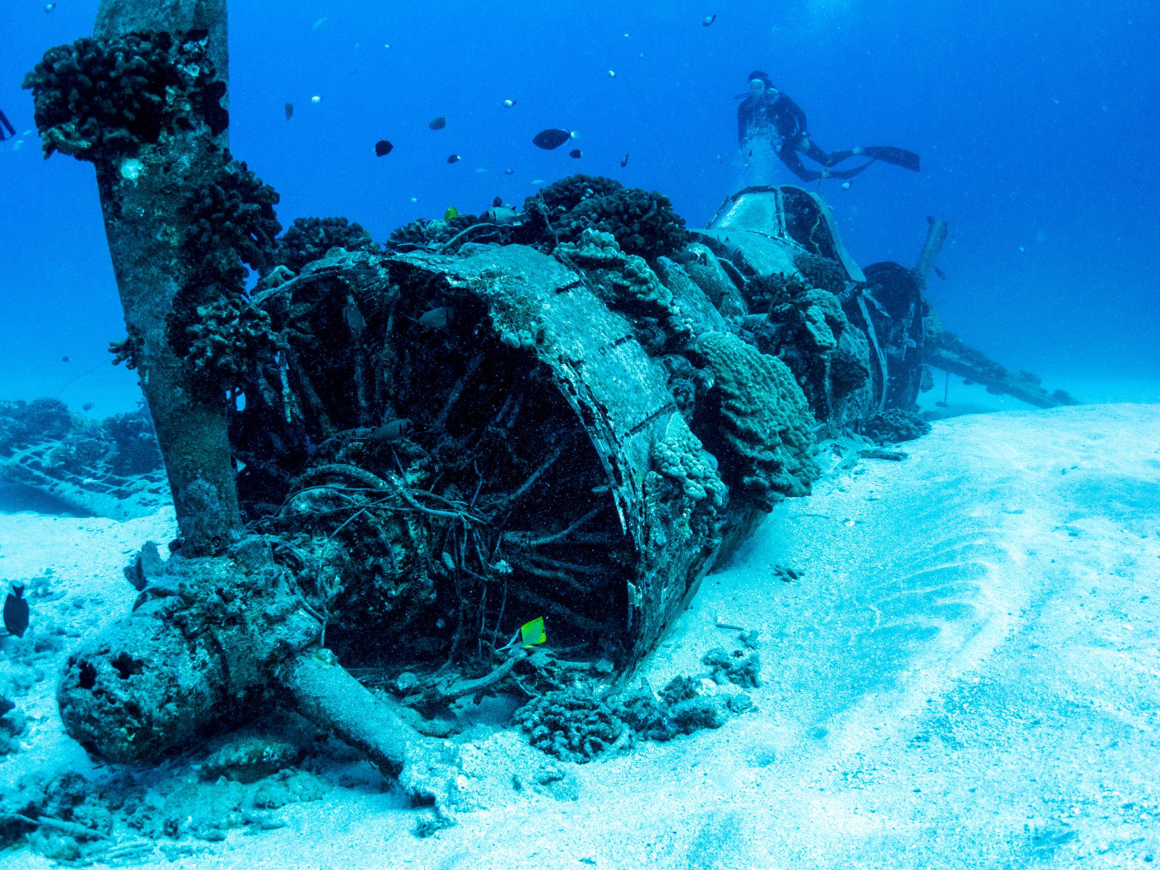 A képen egy második világháborús katonai repülőgép roncsai láthatók a hawaii Oahunál. Személyszállító gépek szerencsére ritkán zuhannak le, de a második világháború alatt rengeteg bombázót lőttek le az óceánok fölött, és a legtöbb roncsot ott hagyták a tengerfenéken. A fenti repülőt egészen véletlenül nem lelőtték, hanem kifogyott az üzemanyaga harc közben, és ezért zuhant le, de rengeteg más műszaki hiba is vezethet ilyen tragédiához. Ma már minden repülőn van fekete doboz, és ha a roncsokat nem is hozzák felszínre, a feketedobozt mindenképp megkeresik, hogy kiderüljön, miért történt a baleset. A repülőgép roncsok a világon mindenhol kedvelt búvárcélpontok.