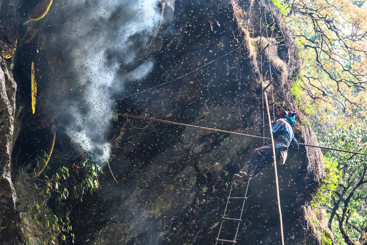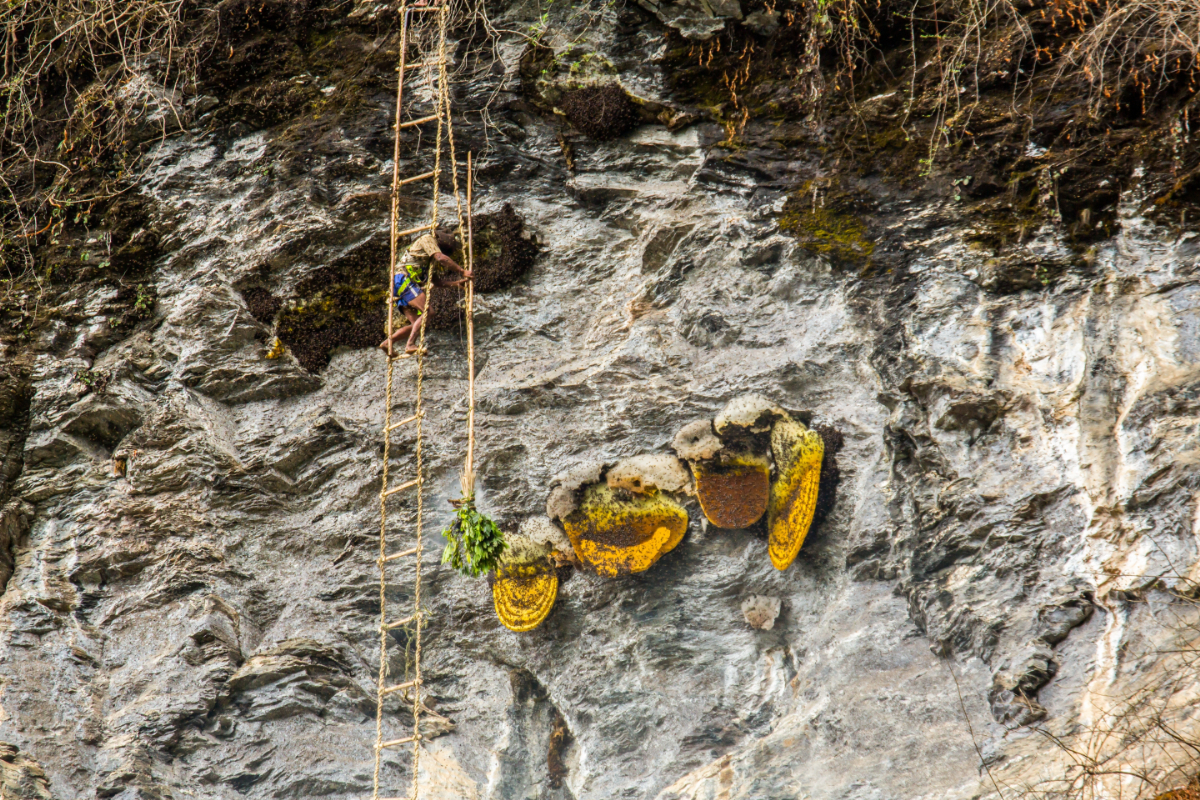 Emiatt érthető, hogy a mézvadászok miért másznak fel a Himalája sziklafalaira azért, hogy begyűjtsék a különlegességet. A feladat azonban közel sem leányálom. A nepáli mézvadászok – elsősorban az őslakos gurung törzs tagjai – általában évente kétszer, tavasszal és ősszel indulnak el több napos útjukra. Ők kézzel készített, közel 100 méter hosszú kötéllétrák segítségével másznak fel a fészkekhez, ahol a szüretelés előtt egy hagyományos rituálét végeznek.